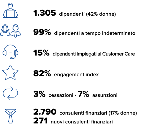 Dipendenti e consulenti finanziari costituiscono il capitale umano di Fineco. Per questo, il Gruppo si impegna ad investire costantemente sul loro sviluppo e la loro crescita, supportandoli e creando un ambiente di lavoro inclusivo e sostenibile.